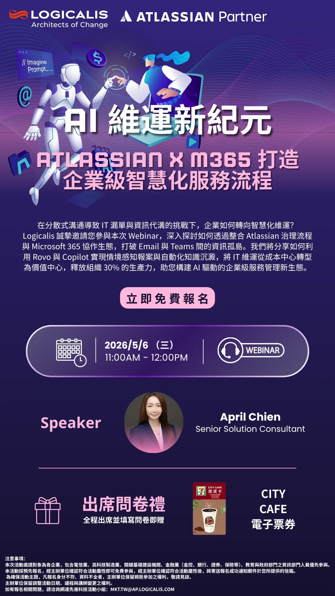 本次活動協助企業探討如何透過整合 Atlassian 治理流程與 Microsoft 365 協作生態,打破 Email 與 Teams 間的資訊孤島。我們將分享如何利用 Rovo 與 Copilot 實現情境感知報案與自動化知識沉澱,將 IT 維運從成本中心轉型為價值中心,釋放組織 30% 的生產力,助您構建 AI 驅動的企業級服務管理新生態。